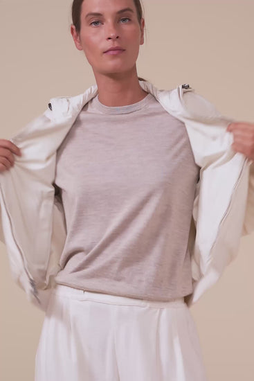 The Start bomber reinterprets the classic hooded jacket through a design that merges technical performance with cashmere warmth. Crafted in Airstop and cashmere flanel, it features refined knit trims and a fluid silhouette—reversible and perfectly balanced for travel, leisure, or city wear.