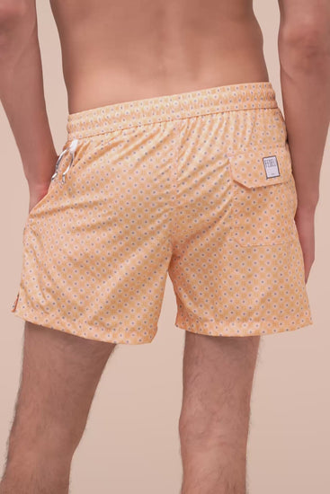 Embrace the Italian summer in unparalleled style with our iconic Madeira swim trunks. Crafted from recycled polyester, they offer a lightweight and quick-drying performance, drying out in only 90 seconds. The elastic waistband with drawstring ensures a perfect fit, while the contrast stitching and embroidered branding logo on the back pocket add a touch of refined elegance Elevated with Summer-y patterns.