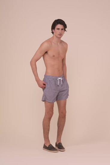 Embrace the Italian summer in unparalleled style with our iconic Madeira swim trunks. Crafted from recycled polyester, they offer a lightweight and quick-drying performance, drying out in only 90 seconds. The elastic waistband with drawstring ensures a perfect fit, while the contrast stitching and embroidered branding logo on the back pocket add a touch of refined elegance Elevated with Summer-y patterns.