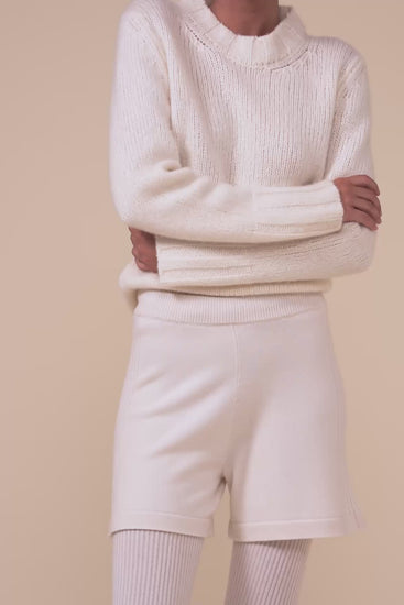 These pure cashmere shorts are knitted in plain stitch with classic rib detail along the sides. The softly structured design includes an elasticated waistband with coulisse,