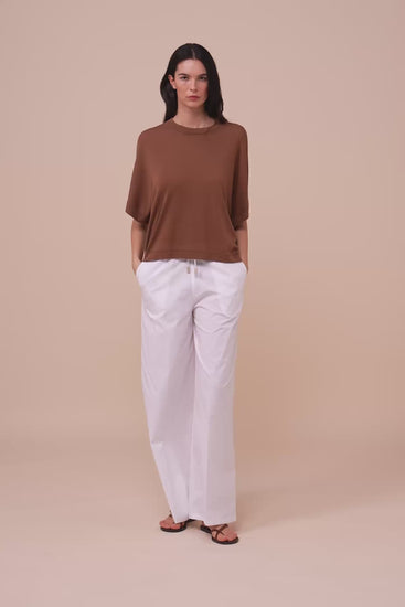 The Millet crewneck knit T-shirt is crafted from a lightweight viscose and linen blend that combines a natural appearance with a deliberately raw, tactile feel. Breathable and fluid, the fabric enhances comfort while maintaining a refined, understated aesthetic. Featuring an oversized, straight-cut silhouette, this knit is completed with tubular and ottoman details at the collar and hem, lending definition to its relaxed form.