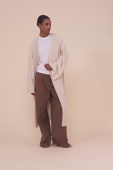 Il cardigan Modì esprime volume e comfort con un’estetica moderna e minimalista. Realizzato in un leggero blend di cashmere e lino, offre una sensazione naturalmente traspirante e una mano morbida. Caratterizzato da una silhouette oversize con maniche raglan e proporzioni ampie, presenta una cintura in maglia full-needle che aggiunge struttura discreta alla forma fluida.