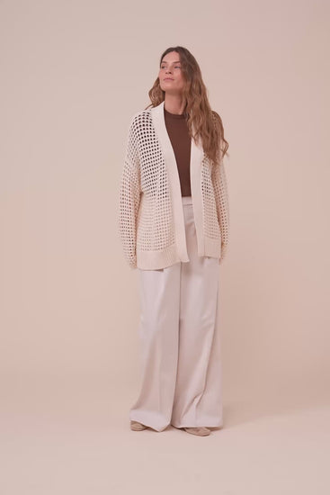 The Munari cardigan reinterprets classic knitwear through a relaxed, architectural lens. Crafted from pure cotton and knitted in an open-floats structure, it offers an airy, tactile feel with a naturally fluid drape. The oversized kimono silhouette is complemented by long sleeves and a refined ribbed placket, creating a harmonious balance between comfort and structure. Pair it with our Lao Vest for a perfectly coordinated set.